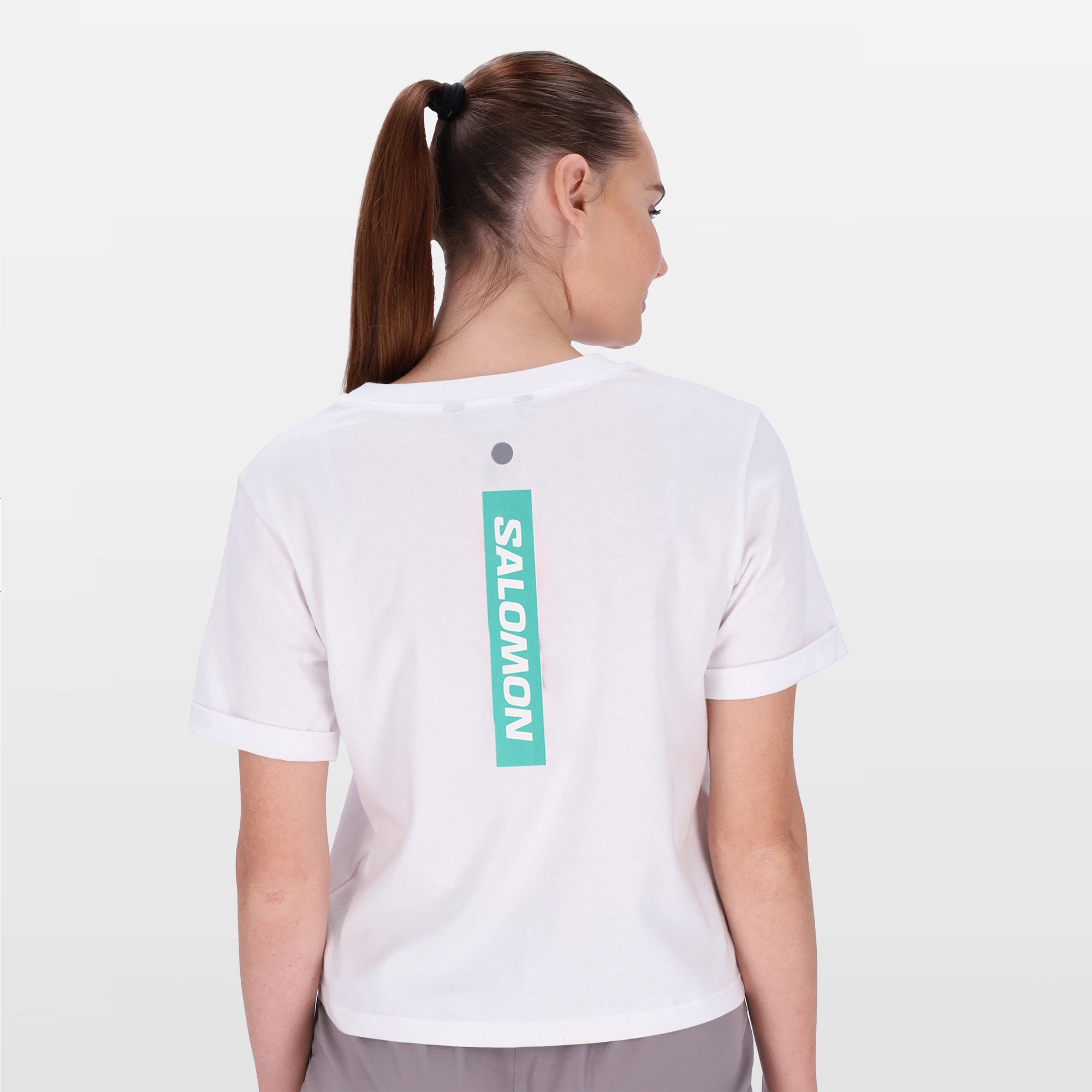 Short sleeve box fit Women's tee shirt with Salomon graphic, turn up sleeves and a cropped length.